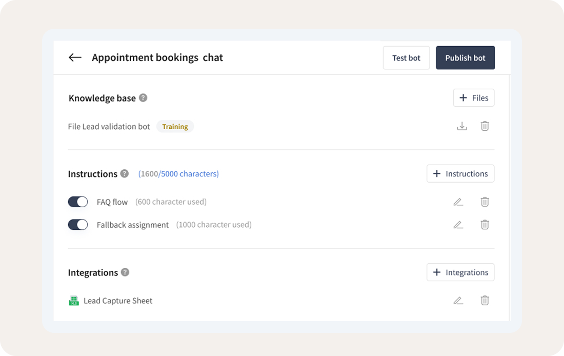 AI voicebots and chatbots for first response, qualification, and routing.