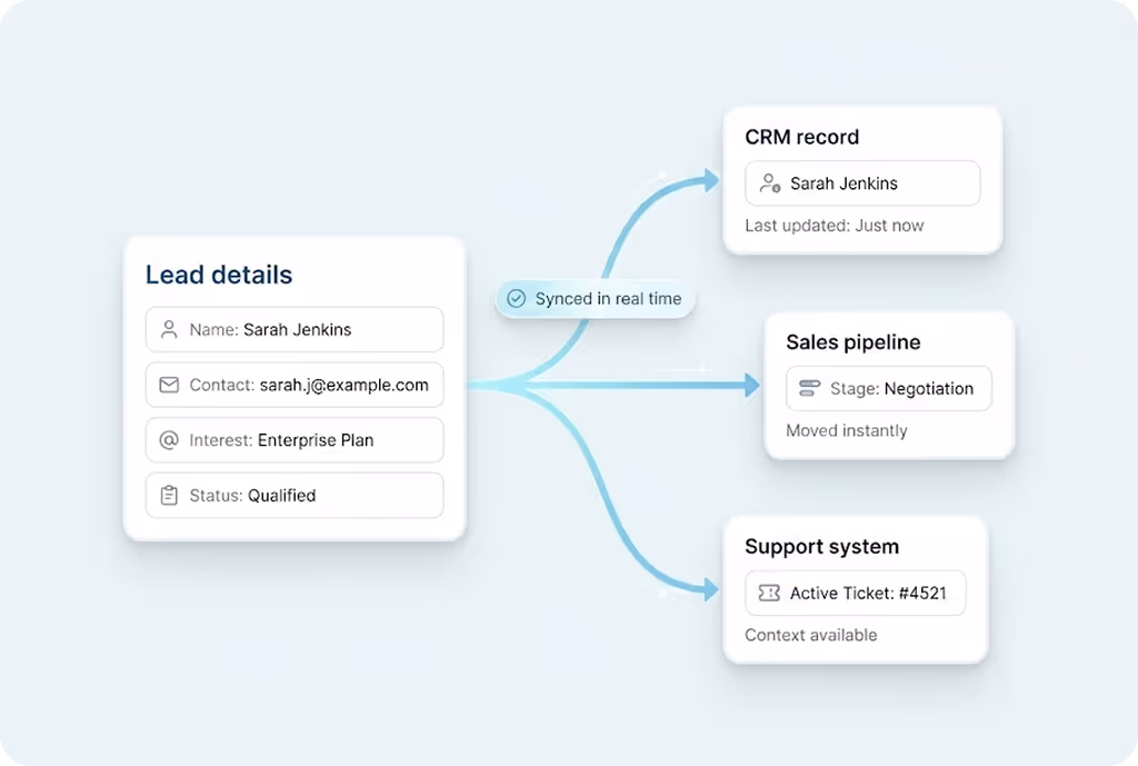 Sales and support teams step in with complete conversation context.