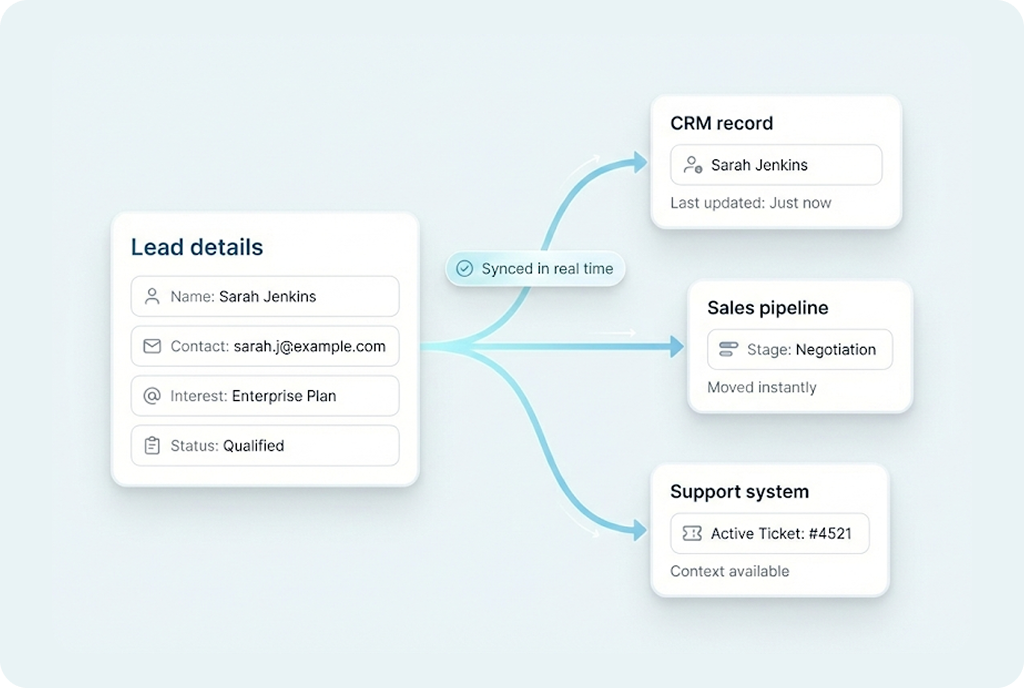 Sales and support teams step in with complete conversation context.