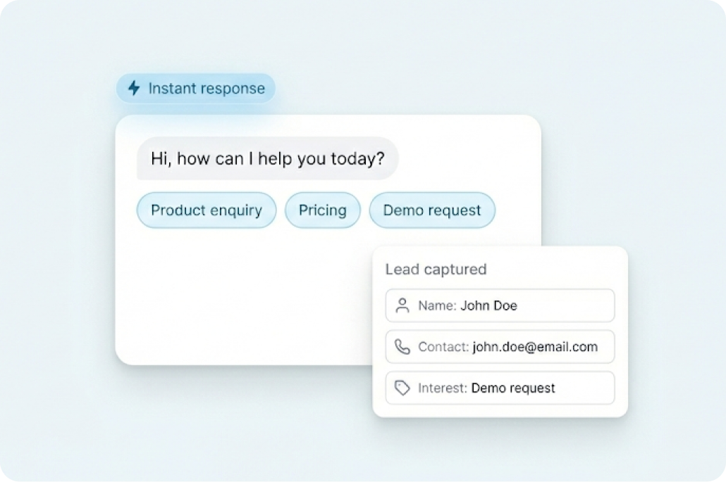 AI voicebots and chatbots that handle first response, qualification, and routing.